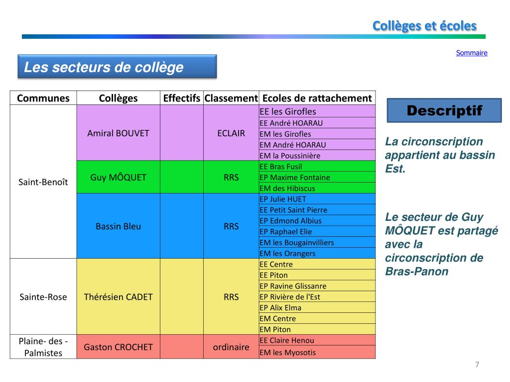 Collèges et écoles Sommaire Les secteurs de collège Descriptif La circonscription appartient au bassin Est. Le secteur de Guy MÔQUET est partagé avec la circonscription de Bras-Panon