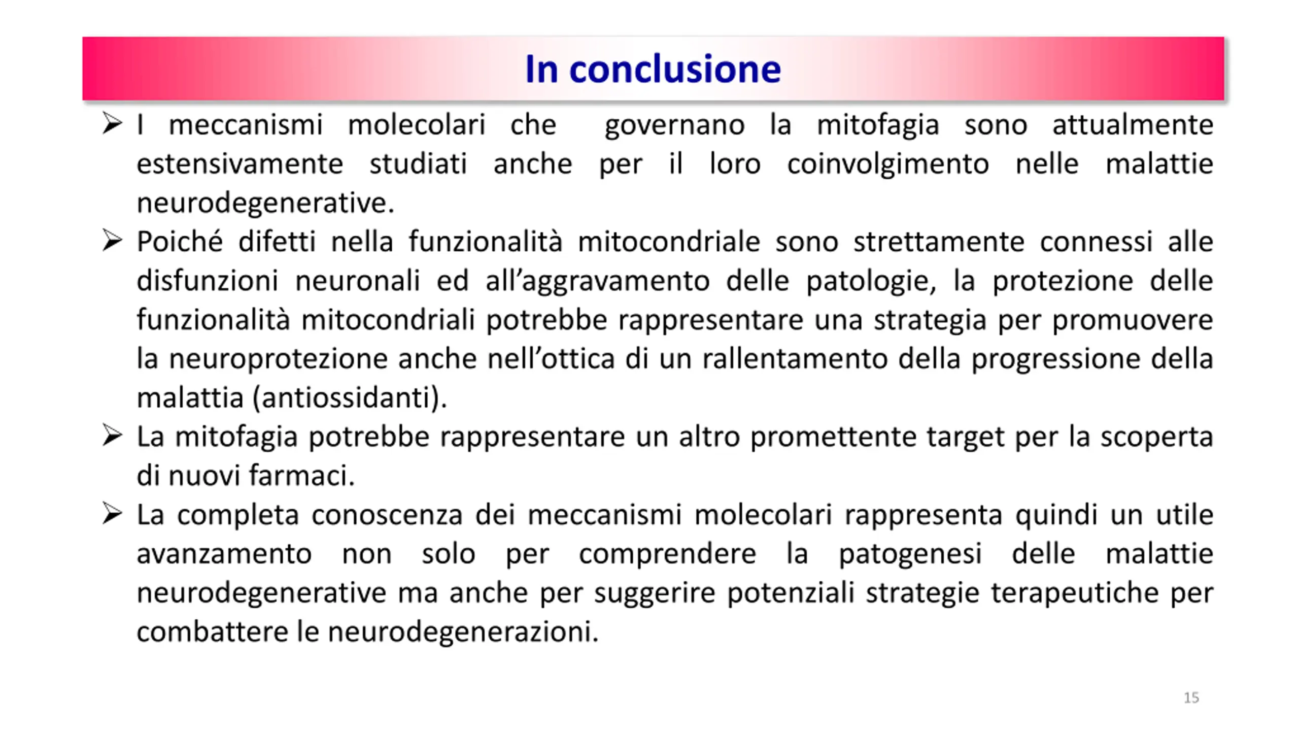 In conclusione I meccanismi molecolari che estensivamente studiati anche per il loro coinvolgimento nelle malattie neurodegenerative. Poiché difetti nella funzionalità mitocondriale sono strettamente connessi alle disfunzioni neuronali ed all’aggravamento delle patologie, la protezione delle funzionalità mitocondriali potrebbe rappresentare una strategia per promuovere la neuroprotezione anche nell’ottica di un rallentamento della progressione della malattia (antiossidanti). La mitofagia potrebbe rappresentare un altro promettente target per la scoperta di nuovi farmaci. La completa conoscenza dei meccanismi molecolari rappresenta quindi un utile avanzamento non solo per comprendere la patogenesi delle malattie neurodegenerative ma anche per suggerire potenziali strategie terapeutiche per combattere le neurodegenerazioni. governano la mitofagia sono attualmente 15