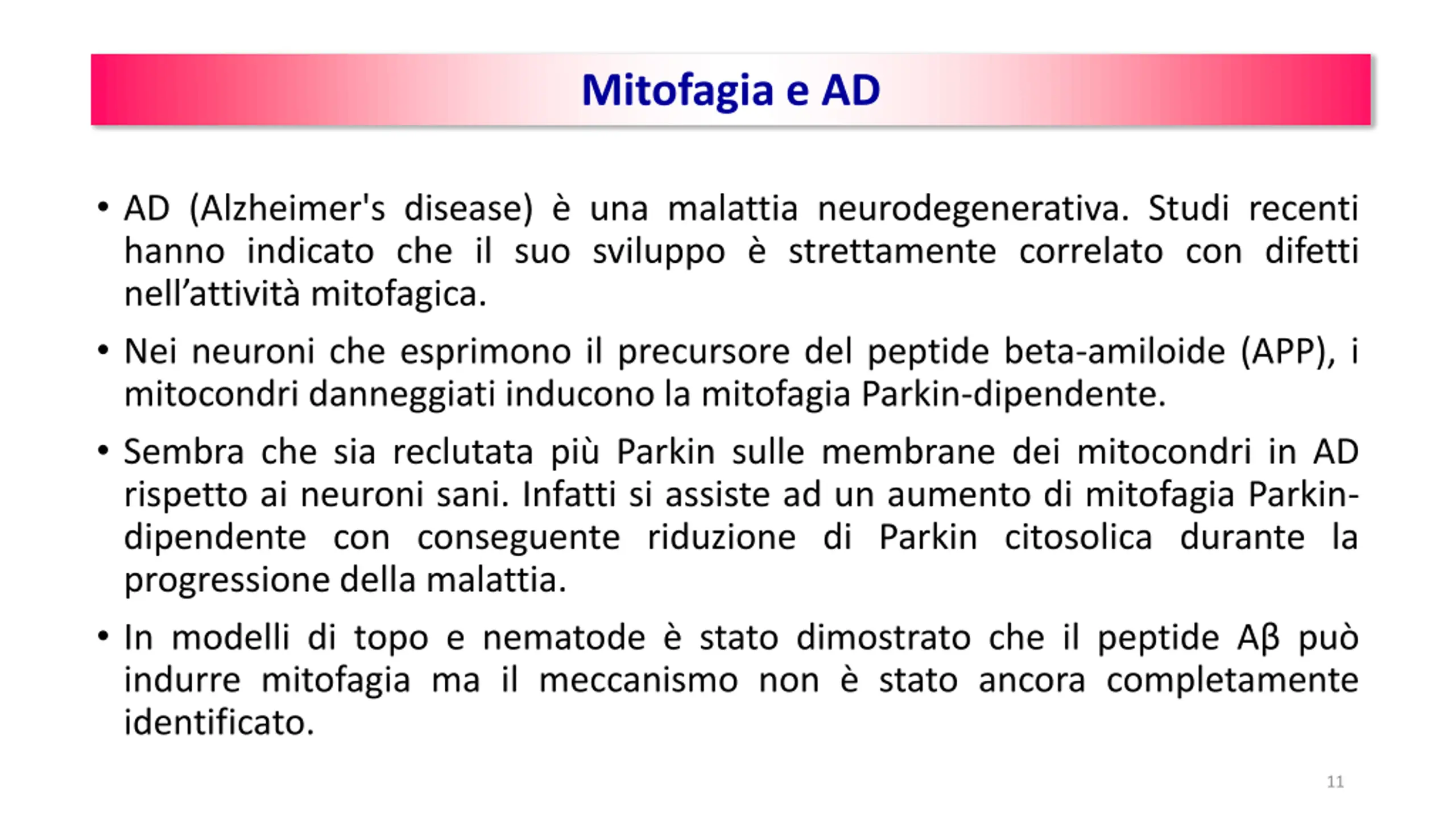 Mitofagia e AD • AD (Alzheimer's disease) è una malattia neurodegenerativa. Studi recenti hanno indicato che il suo sviluppo è strettamente correlato con difetti nell’attività mitofagica. • Nei neuroni che esprimono il precursore del peptide beta-amiloide (APP), i mitocondri danneggiati inducono la mitofagia Parkin-dipendente. • Sembra che sia reclutata più Parkin sulle membrane dei mitocondri in AD rispetto ai neuroni sani. Infatti si assiste ad un aumento di mitofagia Parkin- dipendente con conseguente riduzione di Parkin citosolica durante la progressione della malattia. • In modelli di topo e nematode è stato dimostrato che il peptide Aβ può indurre mitofagia ma il meccanismo non è stato ancora completamente identificato. 11