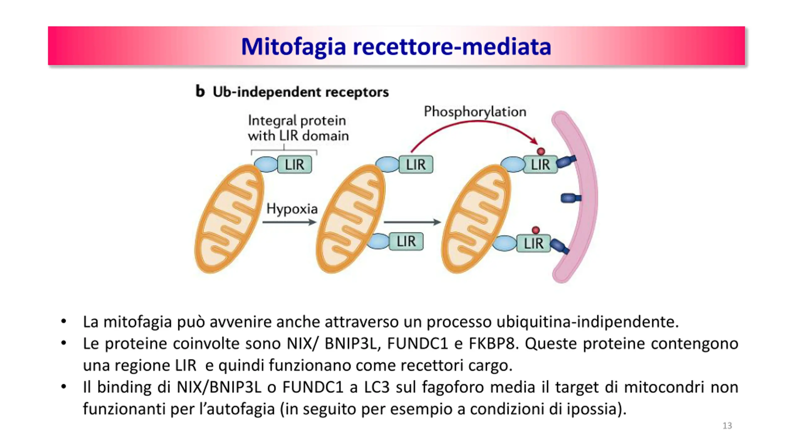 Mitofagia recettore-mediata • La mitofagia può avvenire anche attraverso un processo ubiquitina-indipendente. • Le proteine coinvolte sono NIX/ BNIP3L, FUNDC1 e FKBP8. Queste proteine contengono una regione LIR e quindi funzionano come recettori cargo. • Il binding di NIX/BNIP3L o FUNDC1 a LC3 sul fagoforo media il target di mitocondri non funzionanti per l’autofagia (in seguito per esempio a condizioni di ipossia). 13