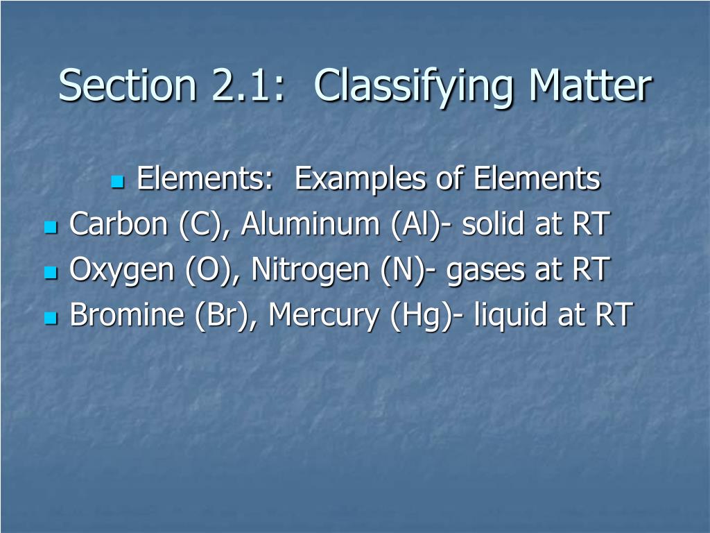 Section 2.1: Classifying Matter • Elements: Examples of Elements • Carbon (C), Aluminum (Al)- solid at RT • Oxygen (O), Nitrogen (N)- gases at RT • Bromine (Br), Mercury (Hg)- liquid at RT