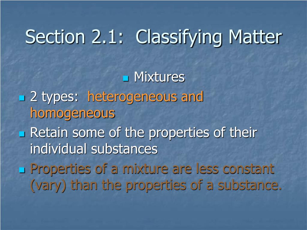 Section 2.1: Classifying Matter • Mixtures • 2 types: heterogeneous and homogeneous • Retain some of the properties of their individual substances • Properties of a mixture are less constant (vary) than the properties of a substance.