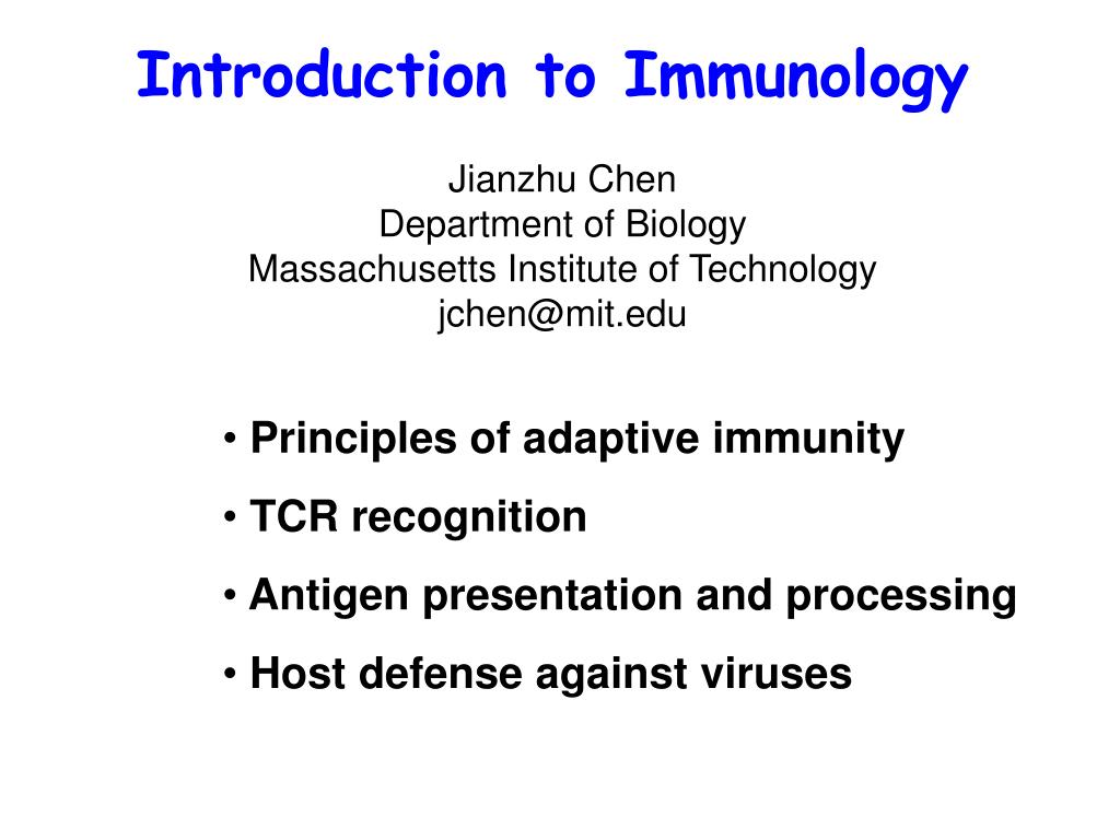 Introduction to Immunology Jianzhu Chen Department of Biology Massachusetts Institute of Technology jchen@mit.edu • Principles of adaptive immunity • TCR recognition • Antigen presentation and processing • Host defense against viruses