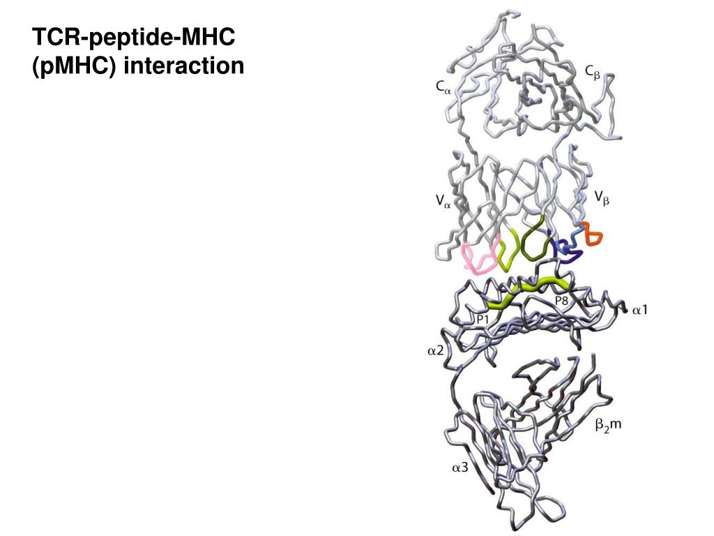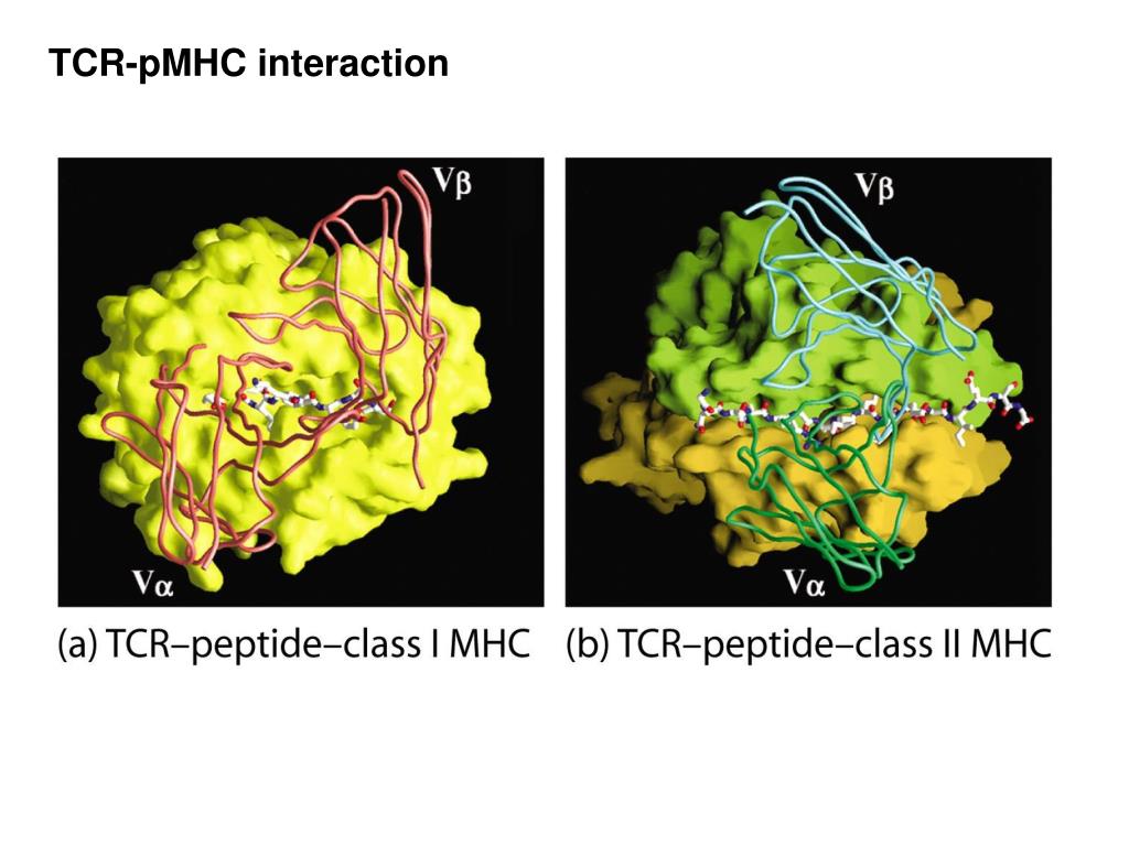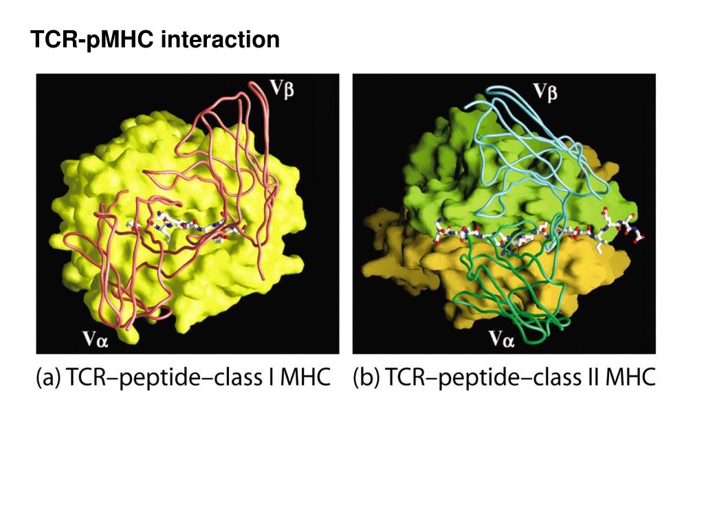 TCR-pMHC interaction Extensive contacts: between TCR and peptide between TCR and MHC TCR molecules are evolved to bind to MHC