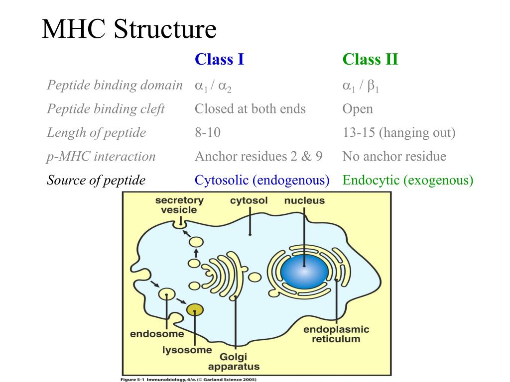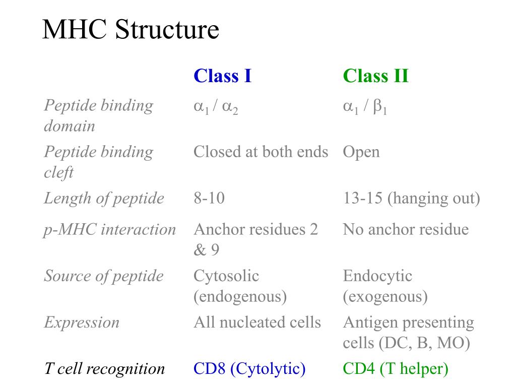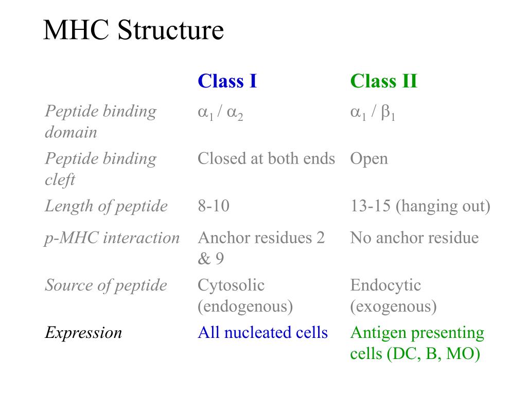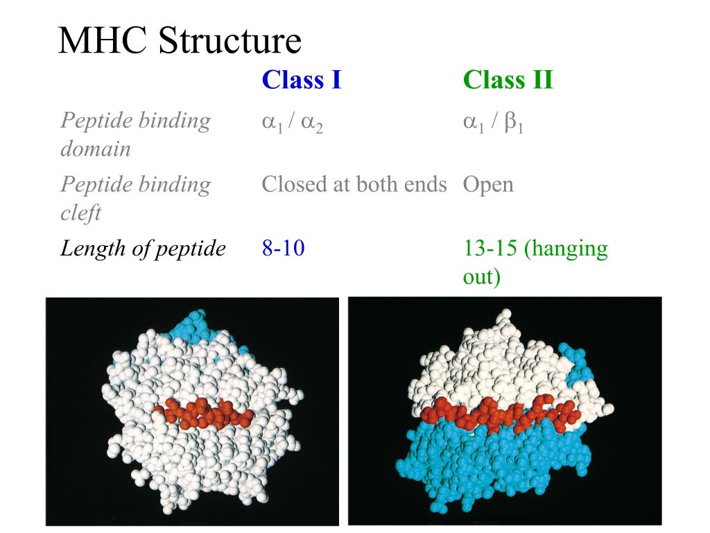 MHC Structure Class I Class II Peptide binding cleft Peptide binding cleft b2m