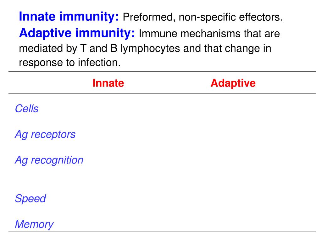 Innate Adaptive Cells Ag receptors Ag recognition Speed Memory Innate immunity: Preformed, non-specific effectors. Adaptive immunity:Immune mechanisms that are mediated by T and B lymphocytes and that change in response to infection.