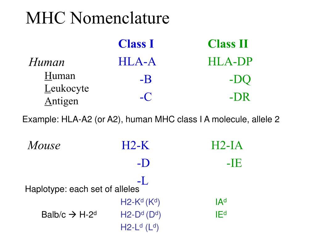 MHC Nomenclature Mouse H2-K -D -L H2-IA -IE Class I Class II HLA-A -B -C HLA-DP -DQ -DR • Human • Human • Leukocyte • Antigen Example: HLA-A2 (or A2), human MHC class I A molecule, allele 2 Haplotype: each set of alleles • H2-Kd (Kd)IAd • Balb/c H-2dH2-Dd (Dd)IEd • H2-Ld (Ld)