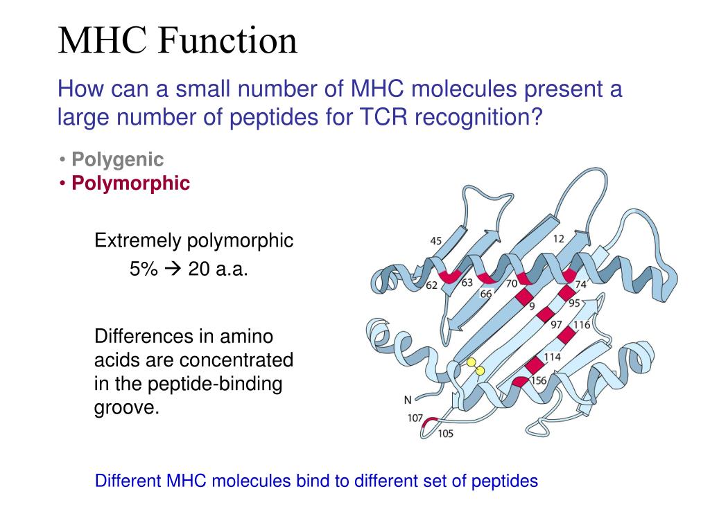 MHC Function Differences in amino acids are concentrated in the peptide-binding groove. Different MHC molecules bind to different set of peptides How can a small number of MHC molecules present a large number of peptides for TCR recognition? • Polygenic • Polymorphic • Extremely polymorphic • 5% 20 a.a.