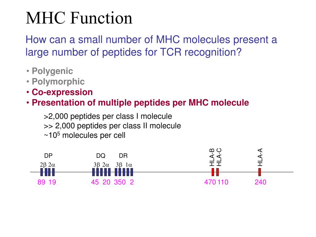 MHC Function DP DQ DR HLA-C HLA-B HLA-A 2b 2a 3b 2a 3b 1a 89 19 45 20 350 2 470 110 240 How can a small number of MHC molecules present a large number of peptides for TCR recognition? • Polygenic • Polymorphic • Co-expression • Presentation of multiple peptides per MHC molecule >2,000 peptides per class I molecule >> 2,000 peptides per class II molecule ~105 molecules per cell