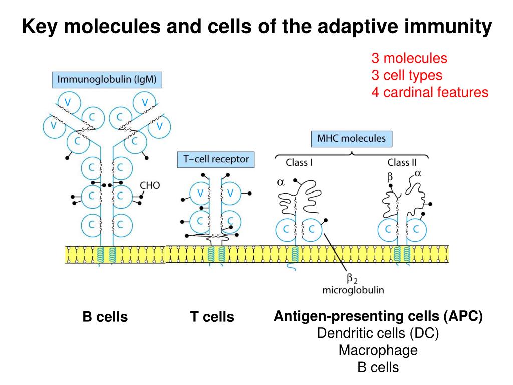 V V V V a V Key molecules and cells of the adaptive immunity 3 molecules 3 cell types 4 cardinal features Antigen-presenting cells (APC) Dendritic cells (DC) Macrophage B cells B cells T cells