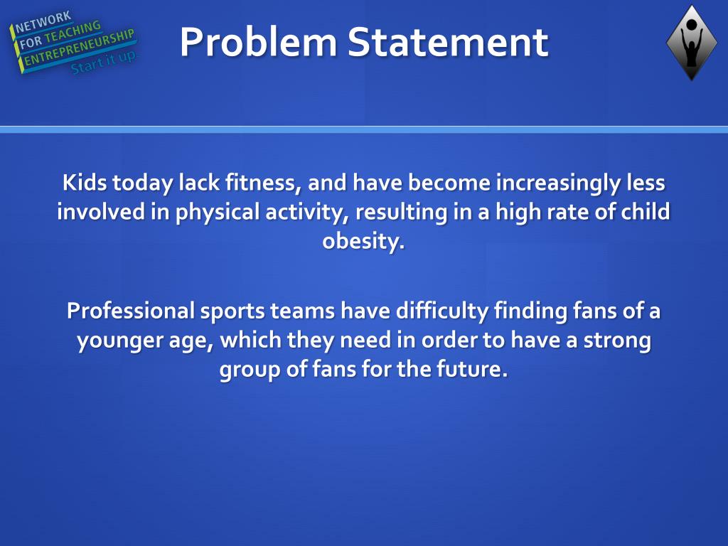 Problem Statement Kids today lack fitness, and have become increasingly less involved in physical activity, resulting in a high rate of child obesity. Professional sports teams have difficulty finding fans of a younger age, which they need in order to have a strong group of fans for the future.