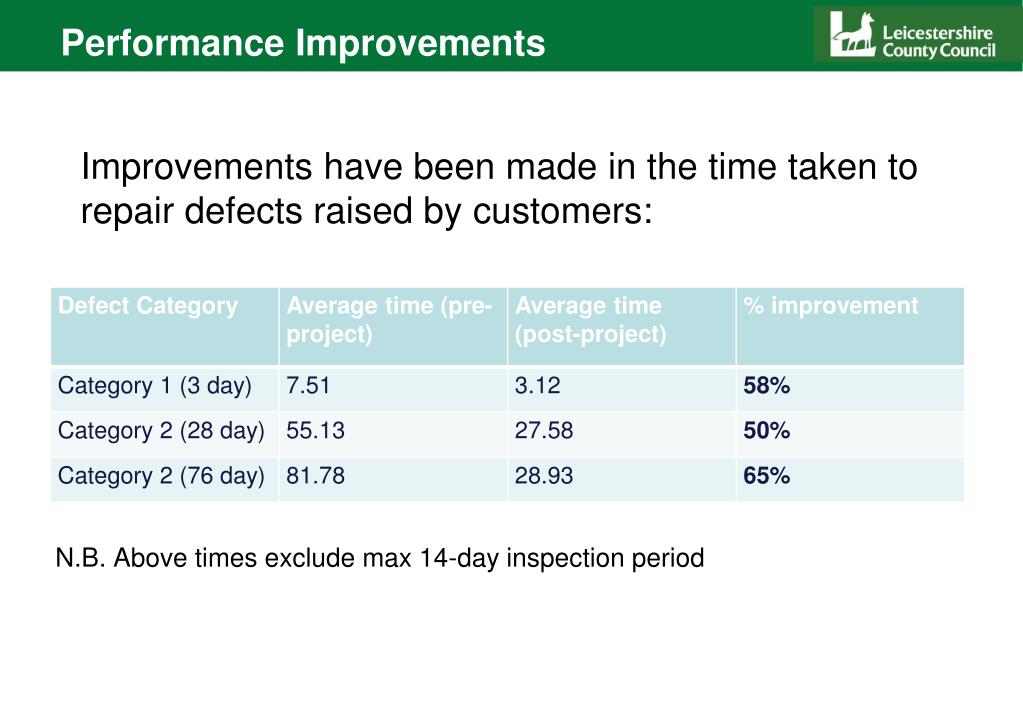 Performance Improvements Improvements have been made in the time taken to repair defects raised by customers: (Averages taken for January to April 2014) N.B. Above times exclude max 14-day inspection period