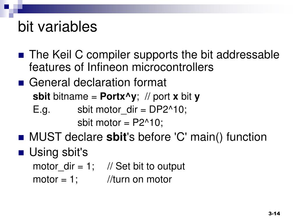 bit variables • The Keil C compiler supports the bit addressable features of Infineon microcontrollers • General declaration format sbit bitname = Portx^y; // port x bit y E.g. sbit motor_dir = DP2^10; sbit motor = P2^10; • MUST declare sbit's before 'C' main() function • Using sbit's motor_dir = 1; // Set bit to output motor = 1; //turn on motor