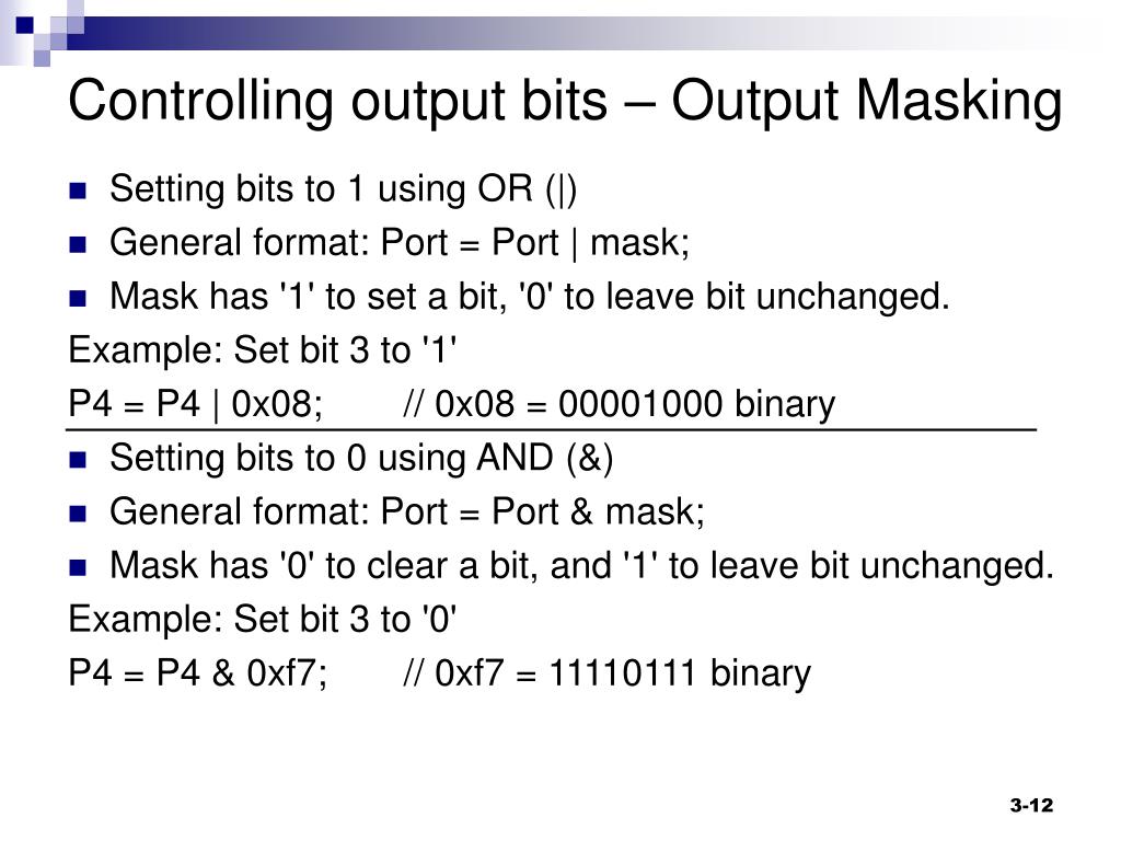 Controlling output bits – Output Masking • Setting bits to 1 using OR (|) • General format: Port = Port | mask; • Mask has '1' to set a bit, '0' to leave bit unchanged. Example: Set bit 3 to '1' P4 = P4 | 0x08; // 0x08 = 00001000 binary • Setting bits to 0 using AND (&) • General format: Port = Port & mask; • Mask has '0' to clear a bit, and '1' to leave bit unchanged. Example: Set bit 3 to '0' P4 = P4 & 0xf7; // 0xf7 = 11110111 binary