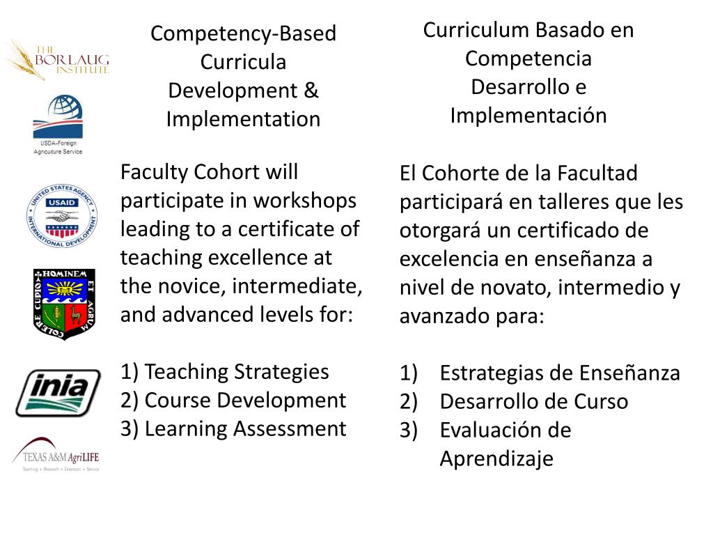 Curriculum Basado en CompetenciaDesarrollo e Implementación Competency-Based Curricula Development & Implementation Faculty Cohort will participate in workshops leading to a certificate of teaching excellence at the novice, intermediate, and advanced levels for: 1) Teaching Strategies 2) Course Development 3) Learning Assessment El Cohorte de la Facultadparticipará en talleresque les otorgará un certificado de excelencia en enseñanza a nivel de novato, intermedio y avanzadopara: Estrategias de Enseñanza Desarrollo de Curso Evaluación de Aprendizaje