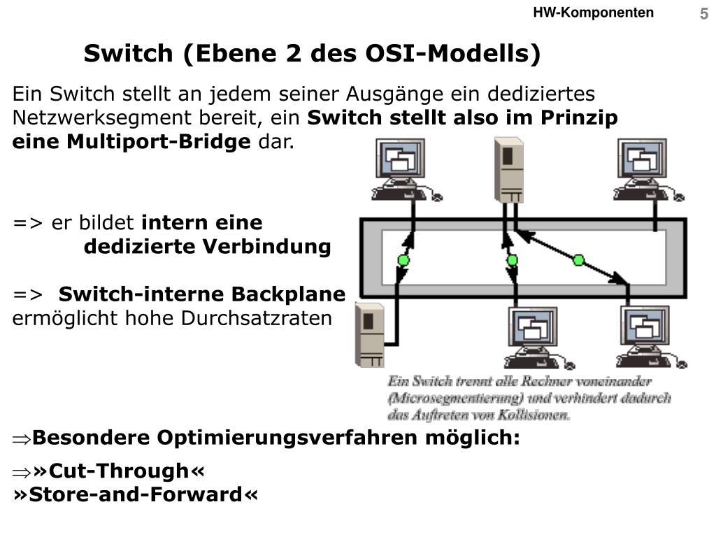 HW-Komponenten • Switch (Ebene 2 des OSI-Modells) • Ein Switch stellt an jedem seiner Ausgänge ein dediziertes Netzwerksegment bereit, ein Switch stellt also im Prinzip eine Multiport-Bridge dar. • => er bildet intern eine dedizierte Verbindung • => Switch-interne Backplane ermöglicht hohe Durchsatzraten • Besondere Optimierungsverfahren möglich: • »Cut-Through« »Store-and-Forward«