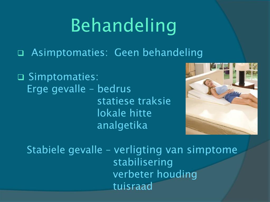 Behandeling • Asimptomaties: Geenbehandeling • Simptomaties: Ergegevalle – bedrus statiesetraksie lokalehitte analgetika Stabielegevalle – verligting van simptome stabilisering verbeterhouding tuisraad