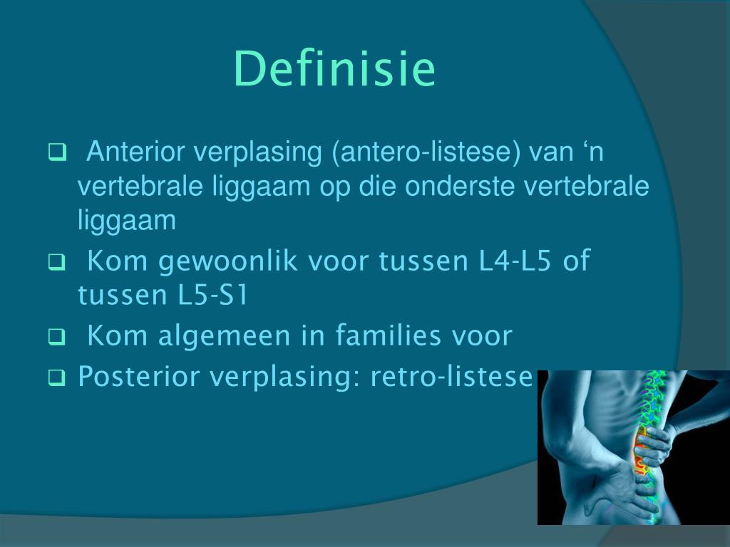 Definisie • Anterior verplasing (antero-listese) van ‘n vertebraleliggaam op die onderstevertebraleliggaam • Komgewoonlikvoortussen L4-L5 of tussen L5-S1 • Komalgemeen in families voor • Posterior verplasing: retro-listese