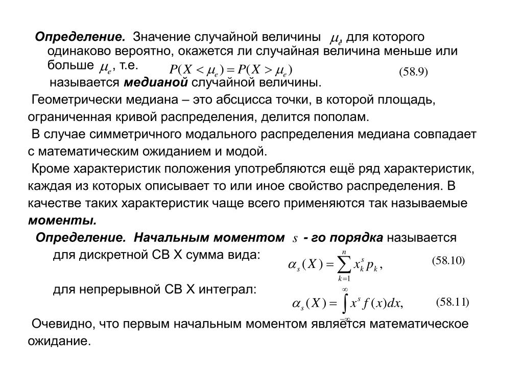 Определение. Значение случайной величины , для которого одинаково вероятно, окажется ли случайная величина меньше или больше , т.е. называется медианой случайнойвеличины. Геометрически медиана – это абсцисса точки, в которой площадь, ограниченная кривой распределения, делится пополам. В случае симметричного модального распределения медиана совпадает с математическим ожиданием и модой. Кроме характеристик положения употребляются ещё ряд характеристик, каждая из которых описывает то или иное свойство распределения. В качестве таких характеристик чаще всего применяются так называемые моменты. Определение. Начальным моментом - го порядка называется для дискретной СВ Х сумма вида: для непрерывной СВ Х интеграл: Очевидно, что первым начальным моментом является математическое ожидание.