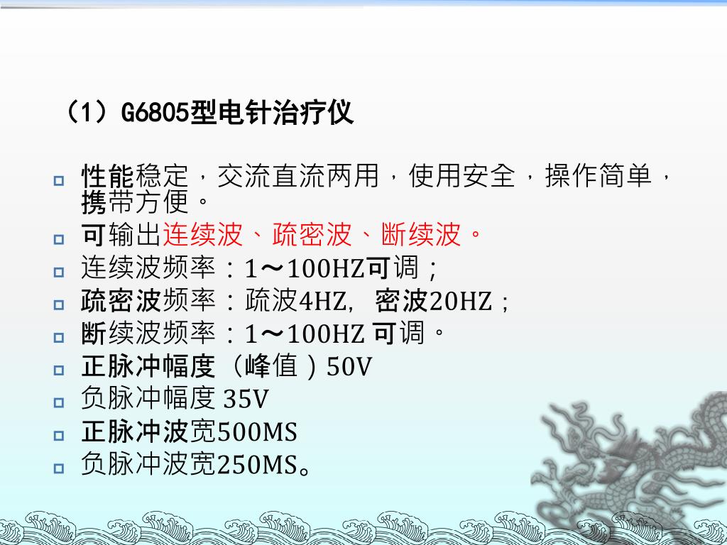 (1)G6805型电针治疗仪 • 性能稳定,交流直流两用,使用安全,操作简单,携带方便。 • 可输出连续波、疏密波、断续波。 • 连续波频率:1~100HZ可调; • 疏密波频率:疏波4HZ,密波20HZ; • 断续波频率:1~100HZ 可调。 • 正脉冲幅度(峰值)50V • 负脉冲幅度35V • 正脉冲波宽500MS • 负脉冲波宽250MS。