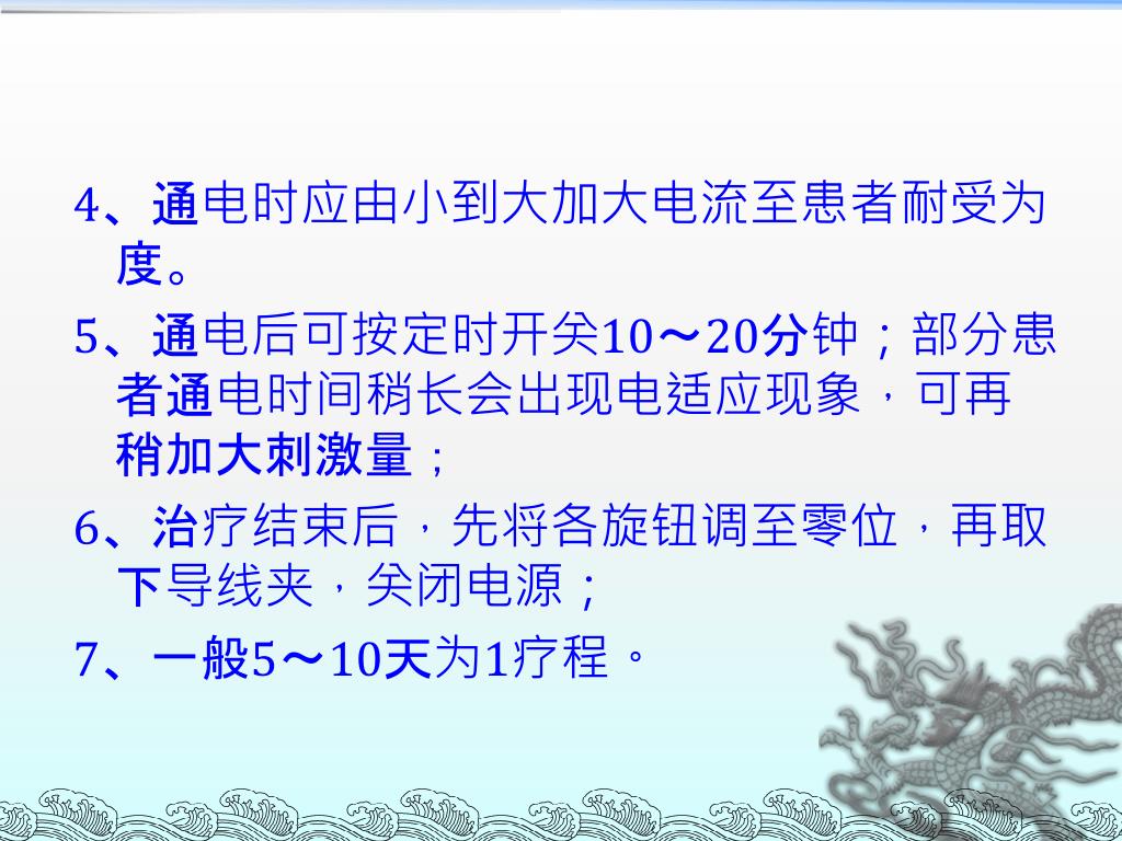 4、通电时应由小到大加大电流至患者耐受为度。4、通电时应由小到大加大电流至患者耐受为度。 5、通电后可按定时开关10~20分钟;部分患者通电时间稍长会出现电适应现象,可再稍加大刺激量; 6、治疗结束后,先将各旋钮调至零位,再取下导线夹,关闭电源; 7、一般5~10天为1疗程。