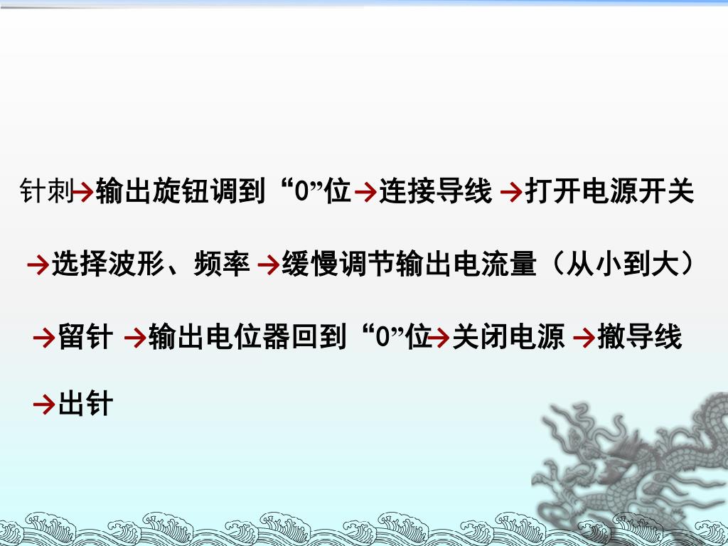 针刺 →输出旋钮调到“0”位 →连接导线 →打开电源开关 →选择波形、频率 →缓慢调节输出电流量(从小到大) →留针 →输出电位器回到“0”位 →关闭电源 →撤导线 →出针