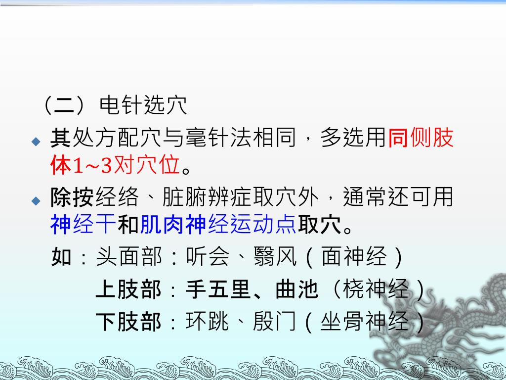 (二)电针选穴 • 其处方配穴与毫针法相同,多选用同侧肢体1~3对穴位。 • 除按经络、脏腑辨症取穴外,通常还可用神经干和肌肉神经运动点取穴。 如:头面部:听会、翳风(面神经) 上肢部:手五里、曲池(桡神经) 下肢部:环跳、殷门(坐骨神经)