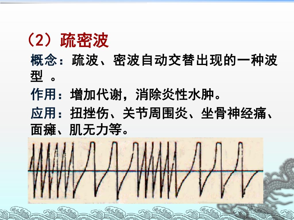 (2)疏密波 概念:疏波、密波自动交替出现的一种波型 。 作用:增加代谢,消除炎性水肿。 应用:扭挫伤、关节周围炎、坐骨神经痛、面瘫、肌无力等。
