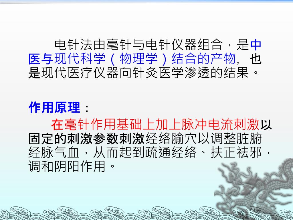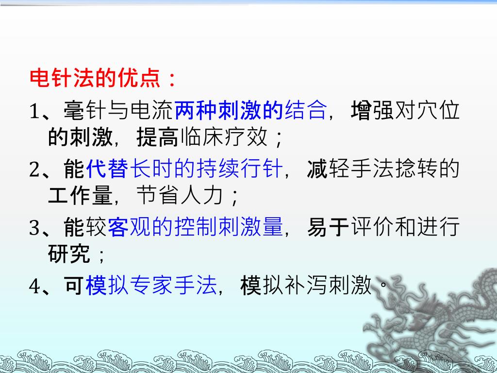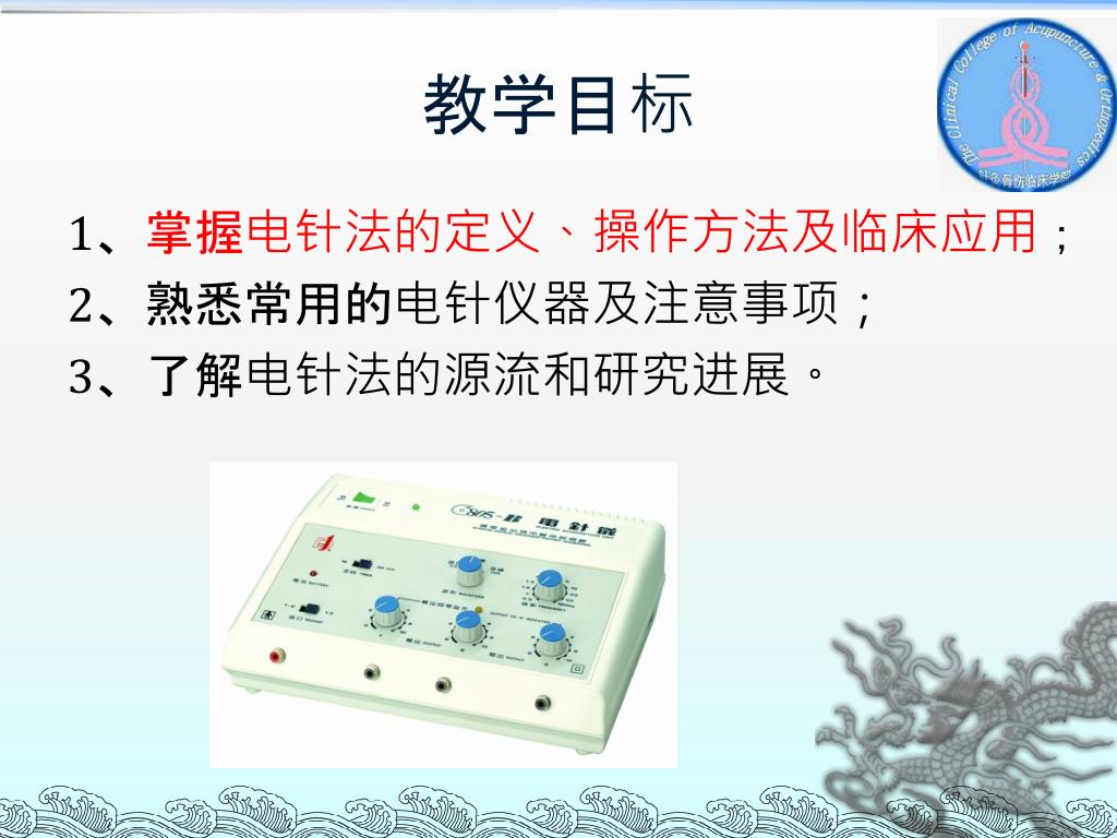 教学目标 1、掌握电针法的定义、操作方法及临床应用; 2、熟悉常用的电针仪器及注意事项; 3、了解电针法的源流和研究进展。