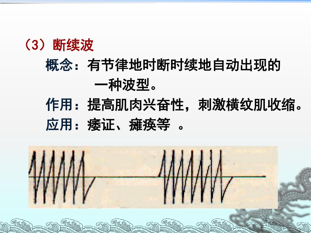 (3)断续波 概念:有节律地时断时续地自动出现的 一种波型。 作用:提高肌肉兴奋性,刺激横纹肌收缩。 应用:痿证、瘫痪等 。