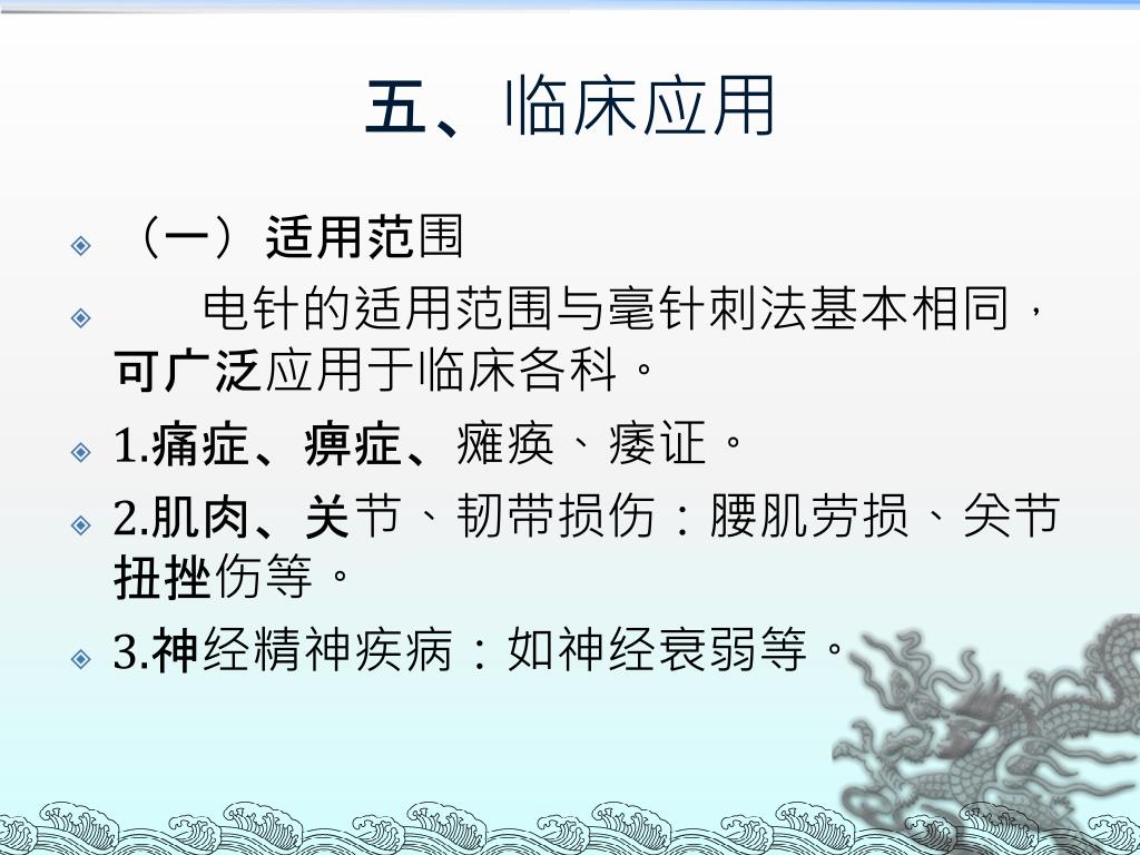 五、临床应用 • (一)适用范围 • 电针的适用范围与毫针刺法基本相同,可广泛应用于临床各科。 • 1.痛症、痹症、瘫痪、痿证。 • 2.肌肉、关节、韧带损伤:腰肌劳损、关节扭挫伤等。 • 3.神经精神疾病:如神经衰弱等。