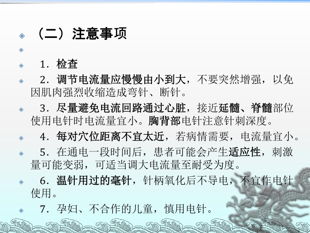 (二)注意事项 • 1.检查 • 2.调节电流量应慢慢由小到大,不要突然增强,以免因肌肉强烈收缩造成弯针、断针。 • 3.尽量避免电流回路通过心脏,接近延髓、脊髓部位使用电针时电流量宜小。胸背部电针注意针刺深度。 • 4.每对穴位距离不宜太近,若病情需要,电流量宜小。 • 5.在通电一段时间后,患者可能会产生适应性,刺激量可能变弱,可适当调大电流量至耐受为度。 • 6.温针用过的毫针,针柄氧化后不导电,不宜作电针使用。 • 7.孕妇、不合作的儿童,慎用电针。