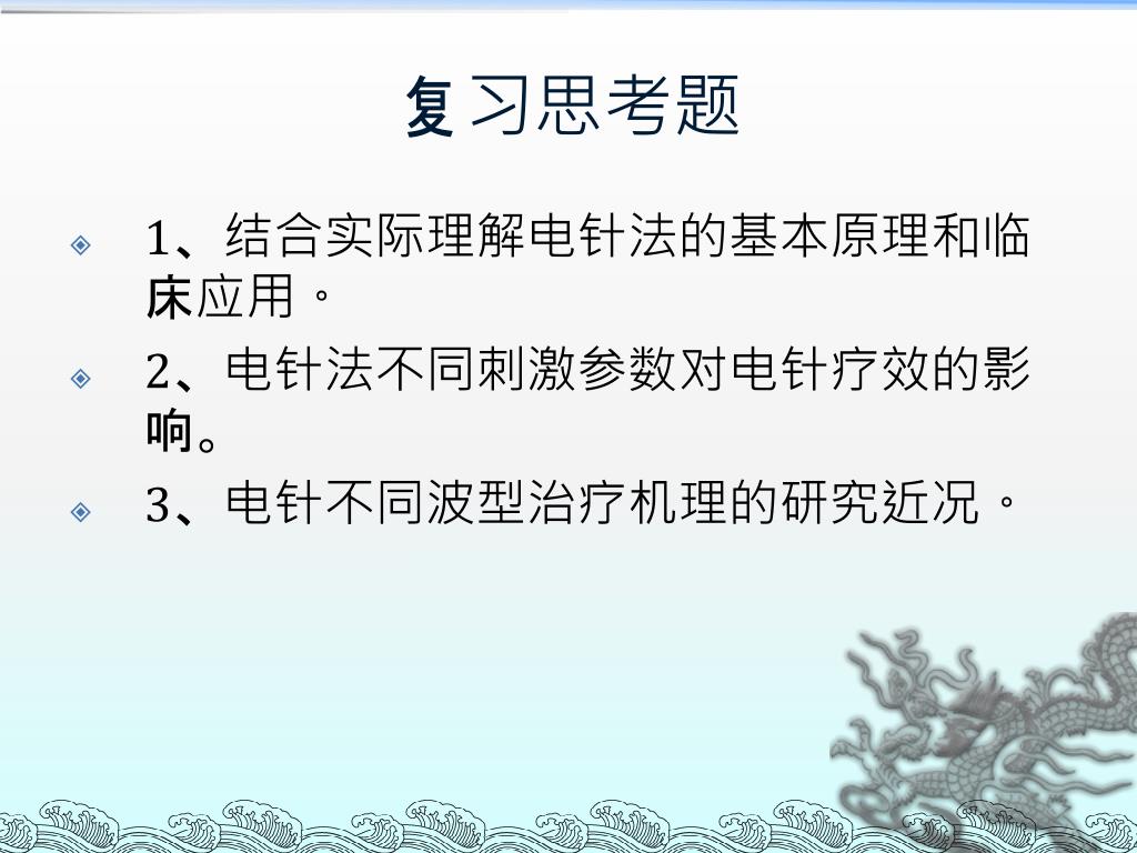 复习思考题 • 1、结合实际理解电针法的基本原理和临床应用。 • 2、电针法不同刺激参数对电针疗效的影响。 • 3、电针不同波型治疗机理的研究近况。