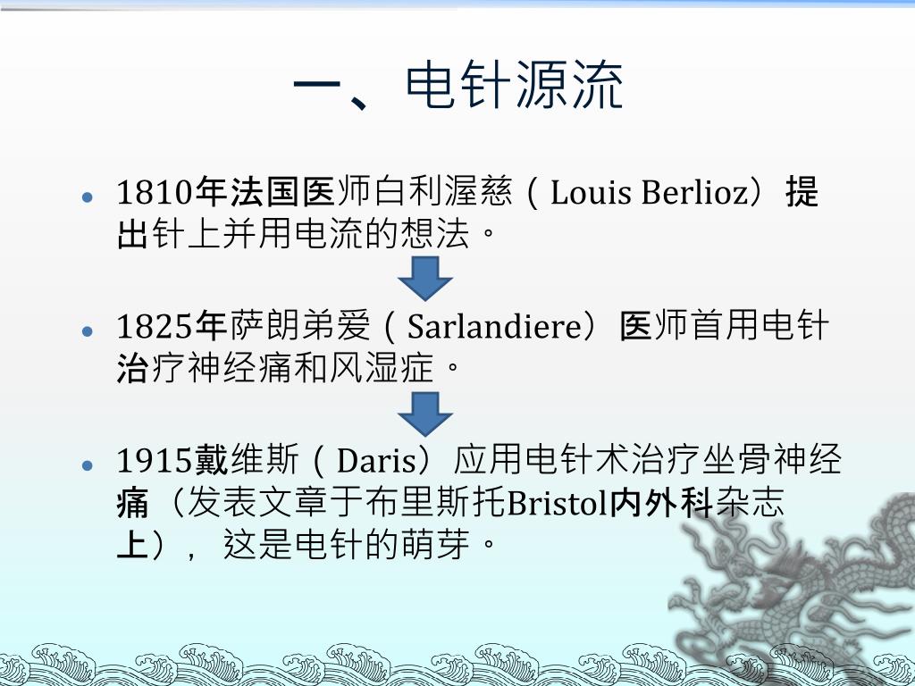 一、电针源流 • 1810年法国医师白利渥慈(Louis Berlioz)提出针上并用电流的想法。 • 1825年萨朗弟爱(Sarlandiere)医师首用电针治疗神经痛和风湿症。 • 1915戴维斯(Daris)应用电针术治疗坐骨神经痛(发表文章于布里斯托Bristol内外科杂志上),这是电针的萌芽。