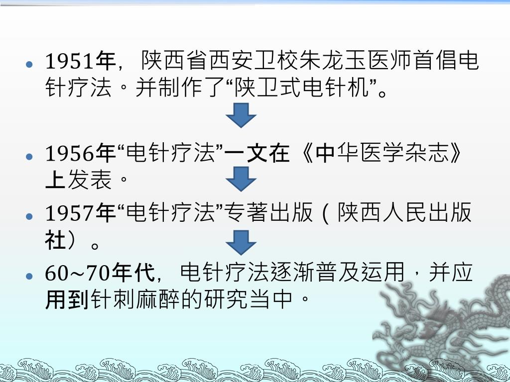 1951年,陕西省西安卫校朱龙玉医师首倡电针疗法。并制作了“陕卫式电针机”。1951年,陕西省西安卫校朱龙玉医师首倡电针疗法。并制作了“陕卫式电针机”。 • 1956年“电针疗法”一文在《中华医学杂志》上发表。 • 1957年“电针疗法”专著出版(陕西人民出版社)。 • 60~70年代,电针疗法逐渐普及运用,并应用到针刺麻醉的研究当中。