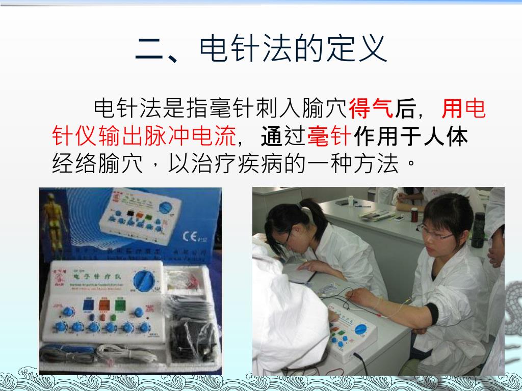 二、电针法的定义 电针法是指毫针刺入腧穴得气后,用电针仪输出脉冲电流,通过毫针作用于人体经络腧穴,以治疗疾病的一种方法。