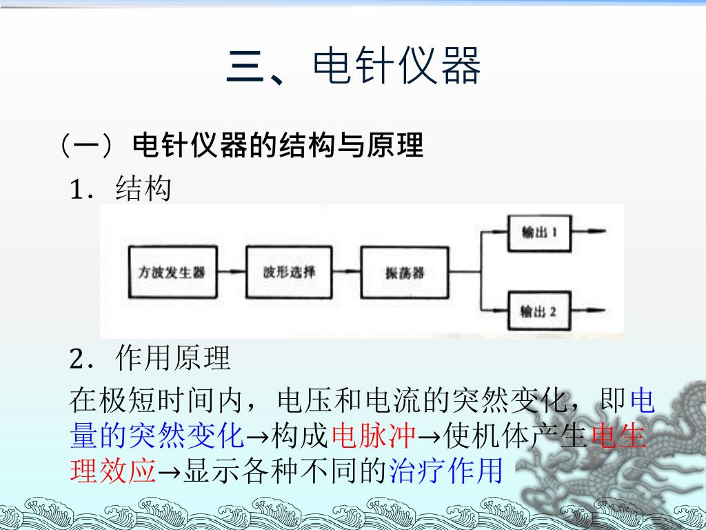 三、电针仪器 (一)电针仪器的结构与原理 1.结构 2.作用原理 在极短时间内,电压和电流的突然变化,即电量的突然变化→构成电脉冲→使机体产生电生理效应→显示各种不同的治疗作用