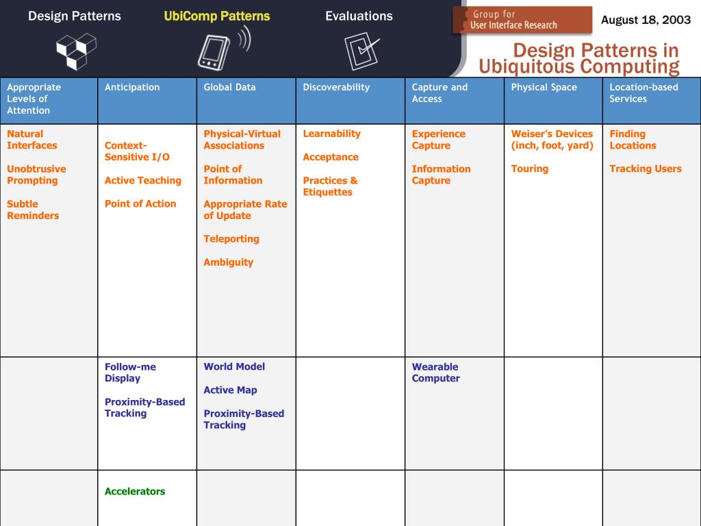 Design Patterns UbiComp Patterns Evaluations Design Patterns for Ubiquitous Computing • Help designers create higher-quality designs faster by developing a pattern language for UbiComp • Difficult to identify patterns because many design issues are still active areas of research • Difficult because certain problems do not have common solutions (have to resort to predictive patterns rather than descriptive)