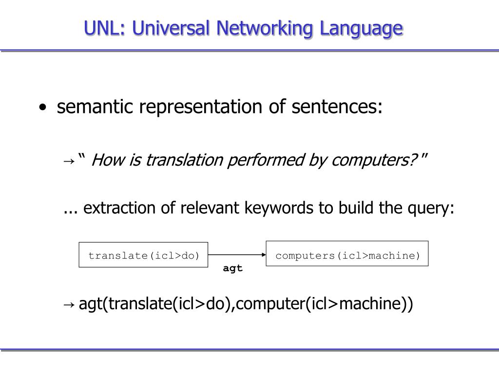 translate(icl>do) computers(icl>machine) agt UNL: Universal Networking Language • semantic representation of sentences: • “ How is translation performed by computers? ” ... extraction of relevant keywords to build the query: • agt(translate(icl>do),computer(icl>machine))