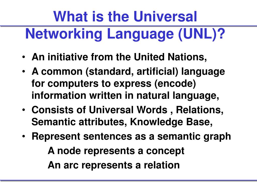 What is the Universal Networking Language(UNL)? • An initiative from the United Nations, • A common (standard, artificial) language for computers to express (encode) information written in natural language, • Consists of Universal Words , Relations, Semantic attributes, Knowledge Base, • Represent sentences as a semantic graph A node represents a concept An arc represents a relation