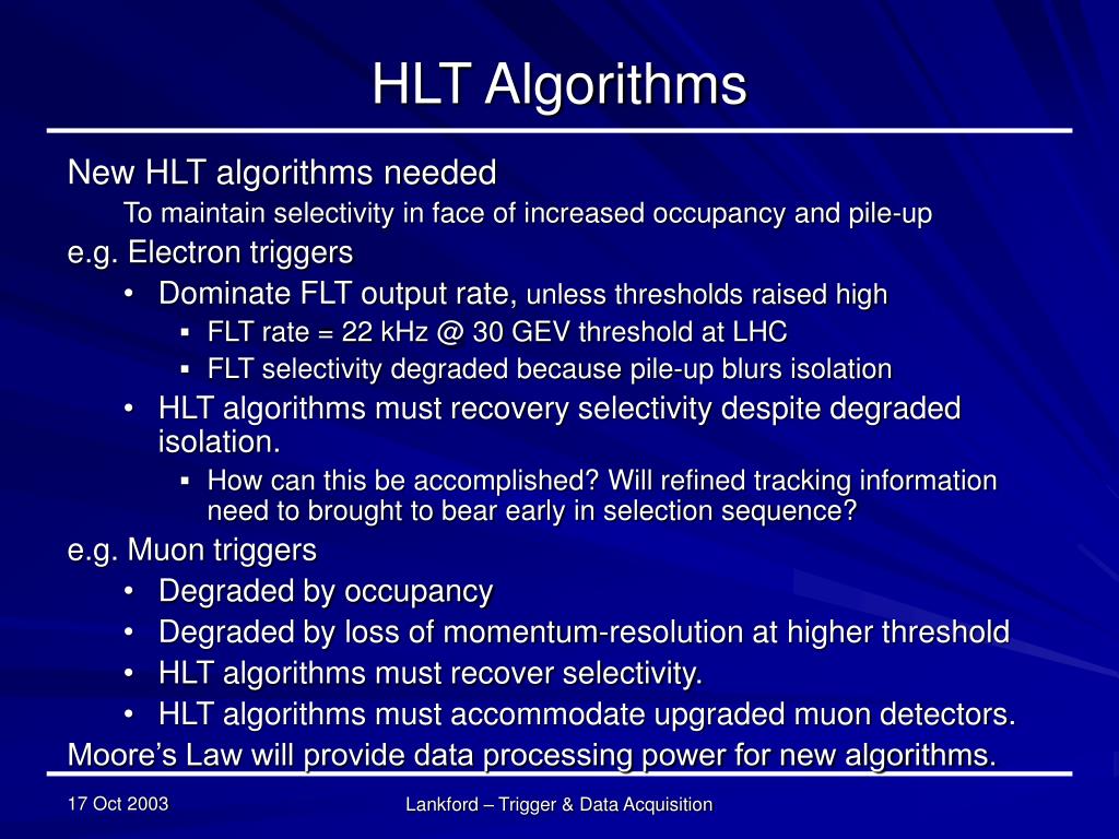 HLT Algorithms • New HLT algorithms needed To maintain selectivity in face of increased occupancy and pile-up • e.g. Electron triggers • Dominate FLT output rate, unless thresholds raised high • FLT rate = 22 kHz @ 30 GEV threshold at LHC • FLT selectivity degraded because pile-up blurs isolation • HLT algorithms must recovery selectivity despite degraded isolation. • How can this be accomplished? Will refined tracking information need to brought to bear early in selection sequence? • e.g. Muon triggers • Degraded by occupancy • Degraded by loss of momentum-resolution at higher threshold • HLT algorithms must recover selectivity. • HLT algorithms must accommodate upgraded muon detectors. • Moore’s Law will provide data processing power for new algorithms. Lankford – Trigger & Data Acquisition