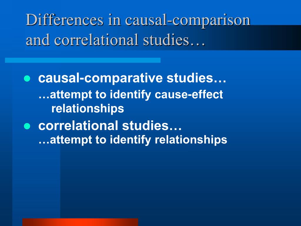 Differences in causal-comparison and correlational studies… • causal-comparative studies… …attempt to identify cause-effect relationships • correlational studies… …attempt to identify relationships