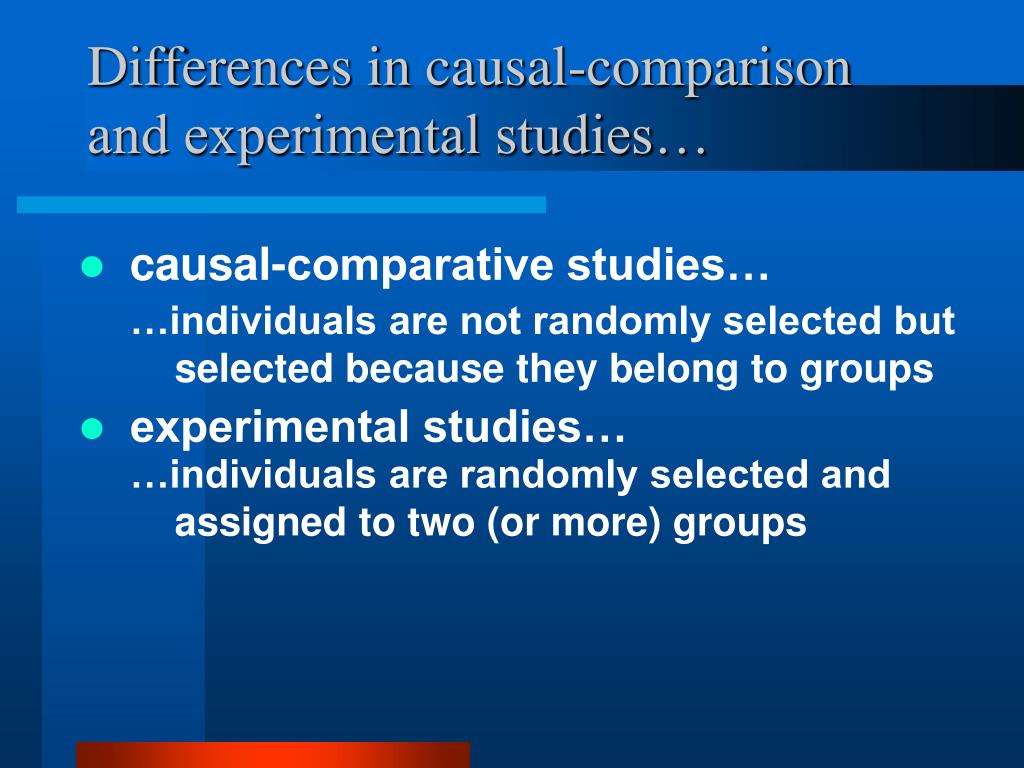 Differences in causal-comparison and experimental studies… • causal-comparative studies… …individuals are not randomly selected but selected because they belong to groups • experimental studies… …individuals are randomly selected and assigned to two (or more) groups