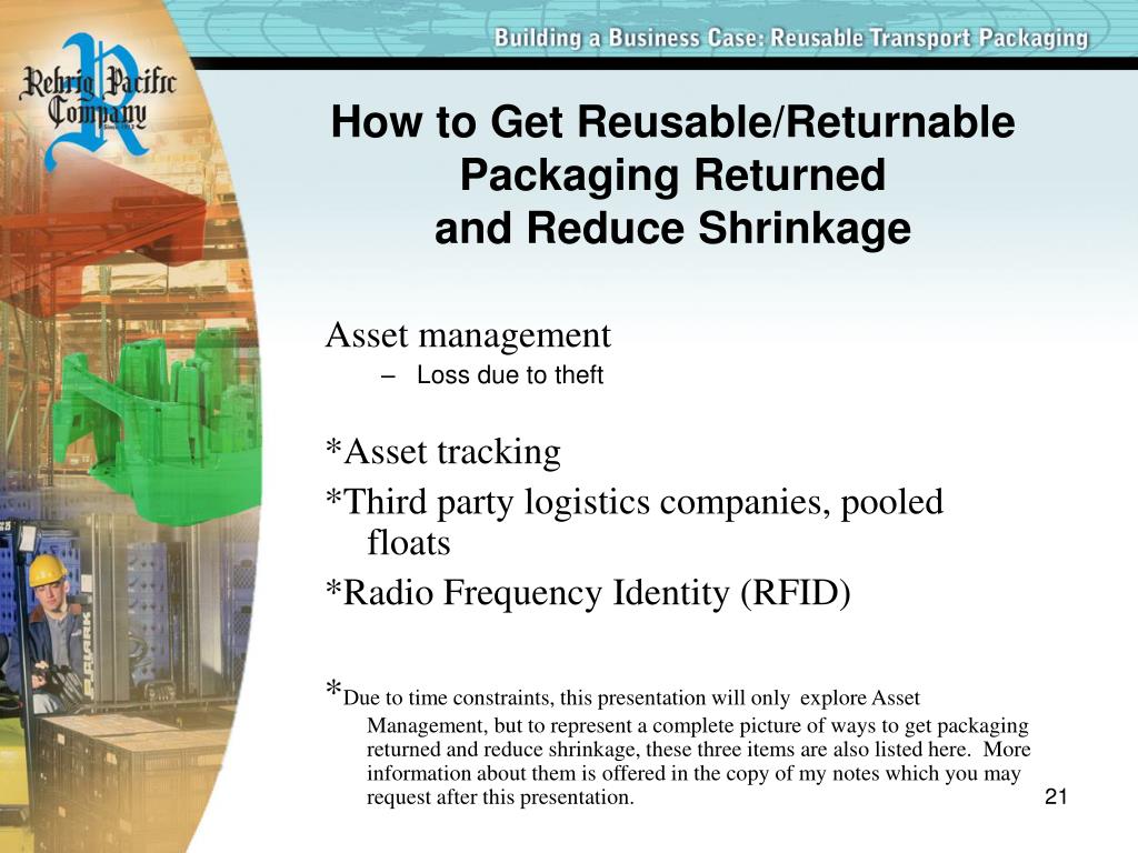 How to Get Reusable/ReturnablePackaging Returnedand Reduce Shrinkage • Asset management • Loss due to theft • *Asset tracking • *Third party logistics companies, pooled floats • *Radio Frequency Identity (RFID) • *Due to time constraints, this presentation will onlyexplore Asset Management, but to represent a complete picture of ways to get packaging returned and reduce shrinkage, these three items are also listed here. More information about them is offered in the copy of my notes which you may request after this presentation.