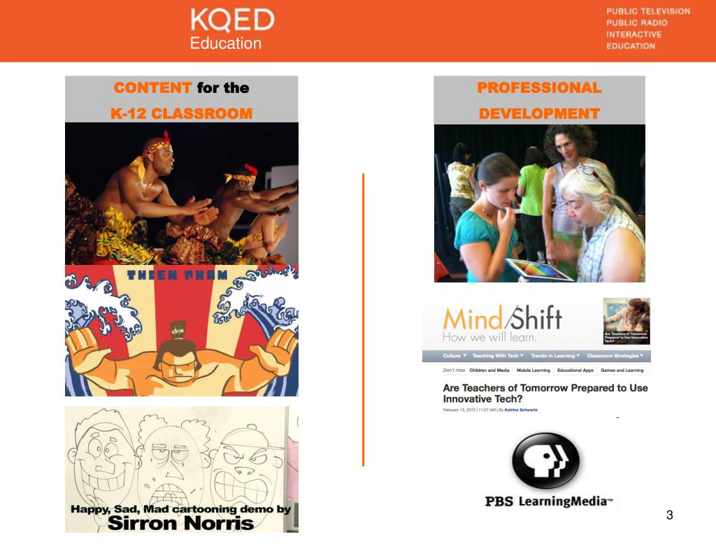 Education. Virtual Visits from Teaching Artists: KQED Art School. Kristin Farr ArtsED @KQED.org. KQED.org /education. Education. Education. CONTENT for the K-12 CLASSROOM. PROFESSIONAL DEVELOPMENT. 3. Education. Why Use Media in the Classroom?