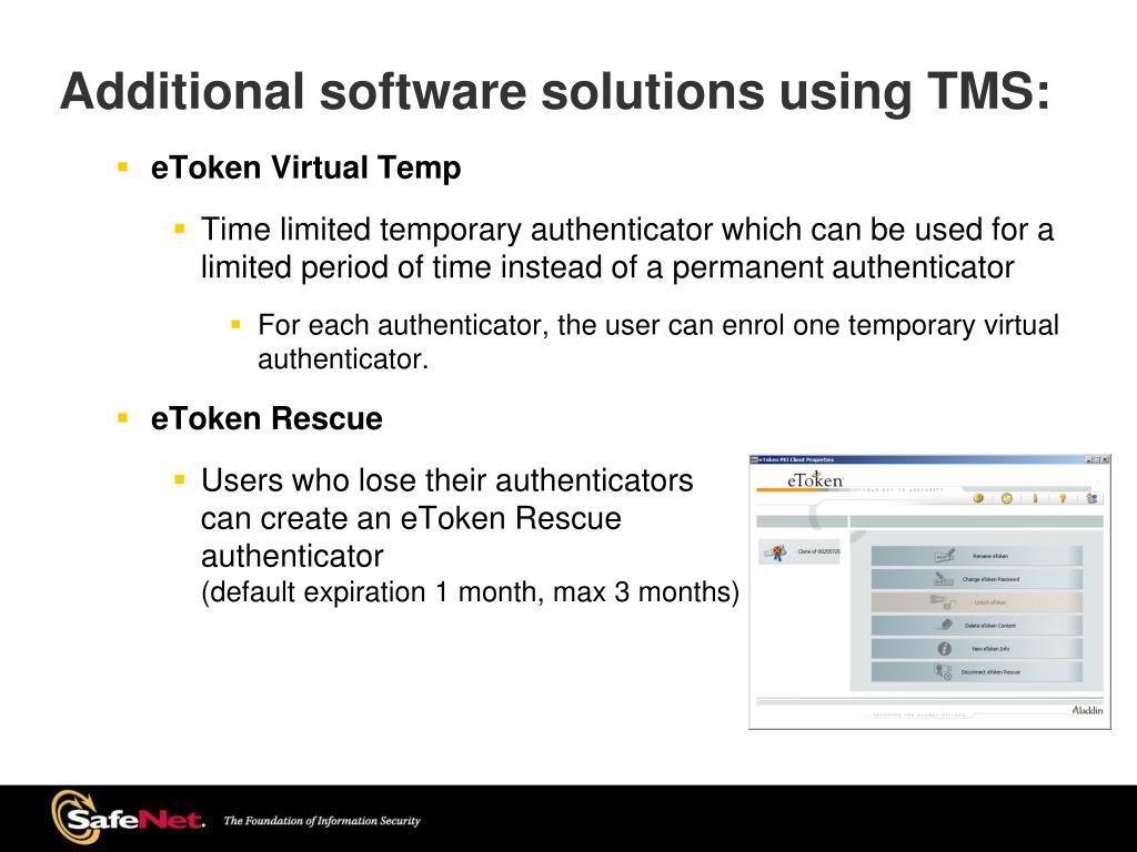 Additional software solutions using TMS: • eToken Virtual Temp • Time limited temporary authenticator which can be used for a limited period of time instead of a permanent authenticator • For each authenticator, the user can enrol one temporary virtual authenticator. • eToken Rescue • Users who lose their authenticators can create an eToken Rescue authenticator(default expiration 1 month, max 3 months)