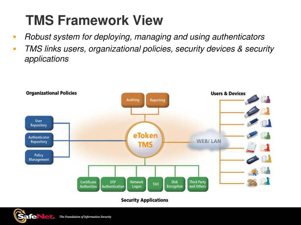 TMS Framework View • Robust system for deploying, managing and using authenticators • TMS links users, organizational policies, security devices & security applications