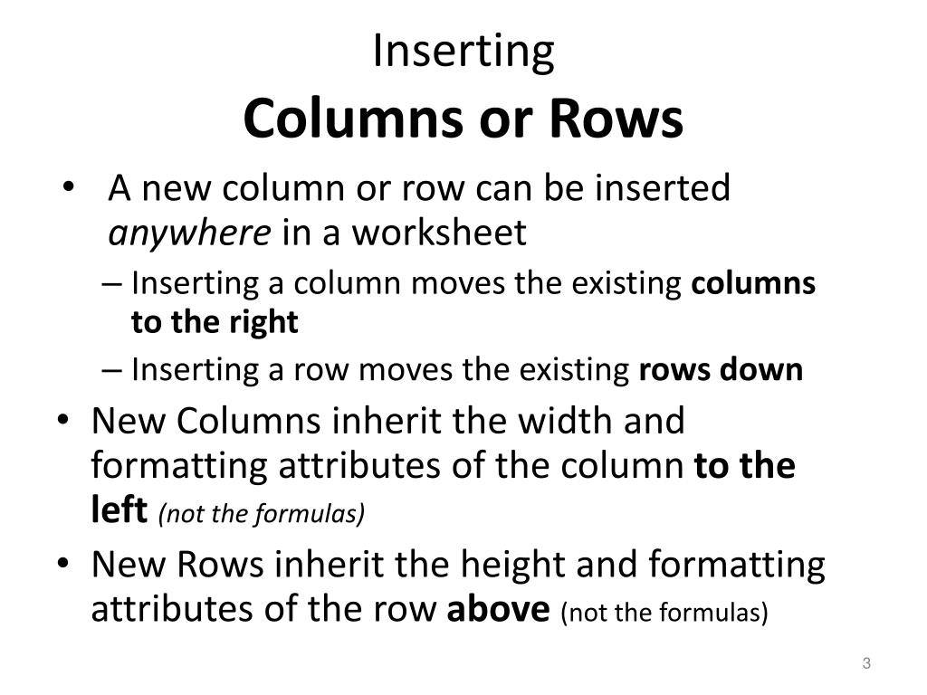 Inserting Columns or Rows • A new column or row can be inserted anywhere in a worksheet • Inserting a column moves the existing columns to the right • Inserting a row moves the existing rows down • New Columns inherit the width and formatting attributes of the column to the left (not the formulas) • New Rows inherit the height and formatting attributes of the row above(not the formulas)