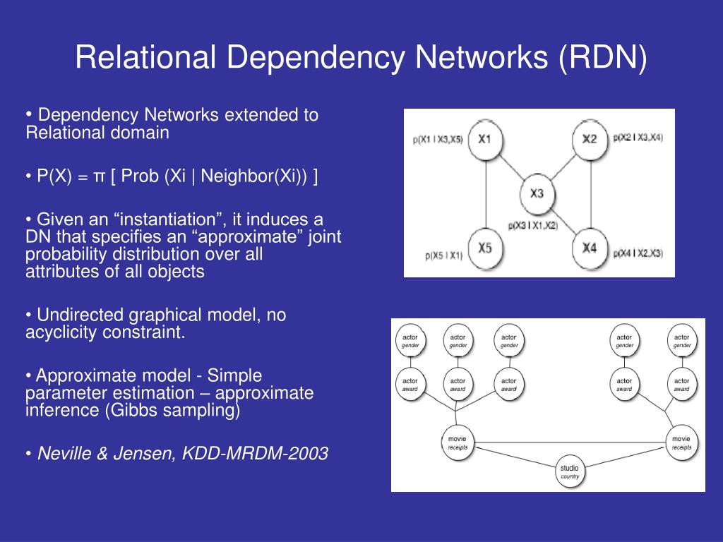 Dependency Networks extended to Relational domain P(X) = π [ Prob (Xi | Neighbor(Xi)) ] Given an “instantiation”, it induces a DN that specifies an “approximate” joint probability distribution over all attributes of all objects Undirected graphical model, no acyclicity constraint. Approximate model - Simple parameter estimation – approximate inference (Gibbs sampling) Neville & Jensen, KDD-MRDM-2003 Relational Dependency Networks (RDN)