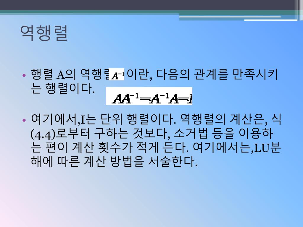 역행렬 • 행렬 A의 역행렬 이란, 다음의 관계를 만족시키는 행렬이다. • 여기에서,I는 단위 행렬이다. 역행렬의 계산은, 식(4.4)로부터 구하는 것보다, 소거법 등을 이용하는 편이 계산 횟수가 적게 든다. 여기에서는,LU분해에 따른 계산 방법을 서술한다.